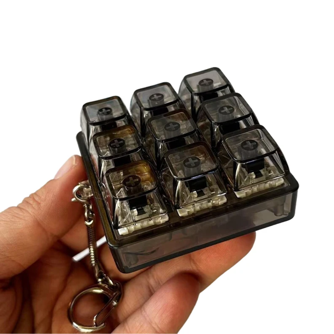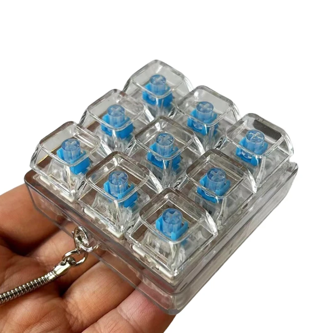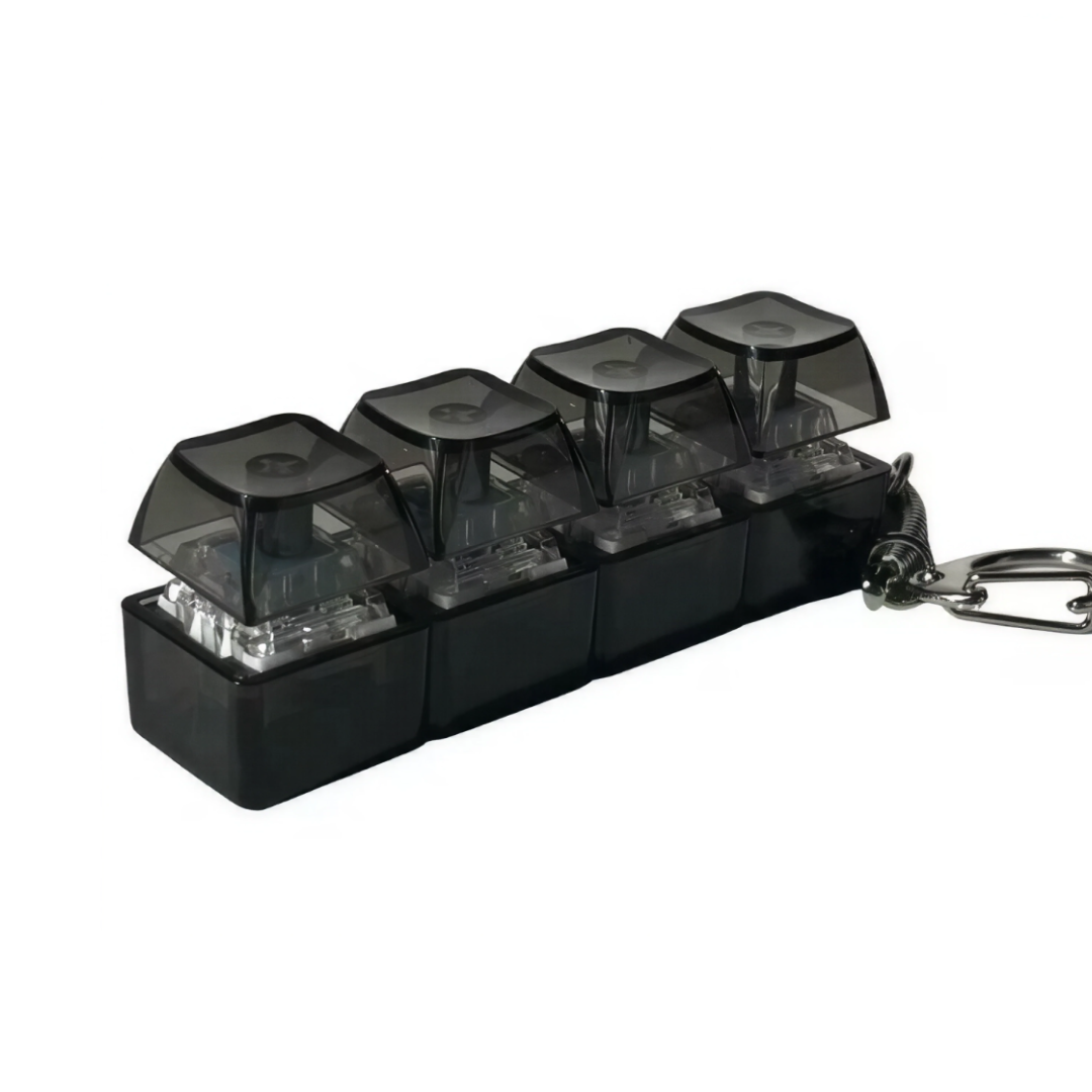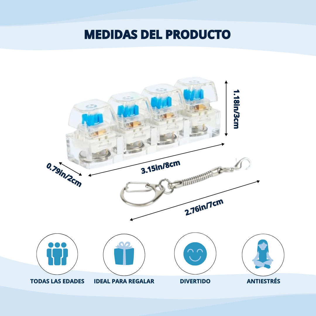Es un llavero inspirado en teclados mecánicos, con switches azules que ofrecen un clic táctil y audible al presionar, perfecto para quienes sufren de ansiedad.